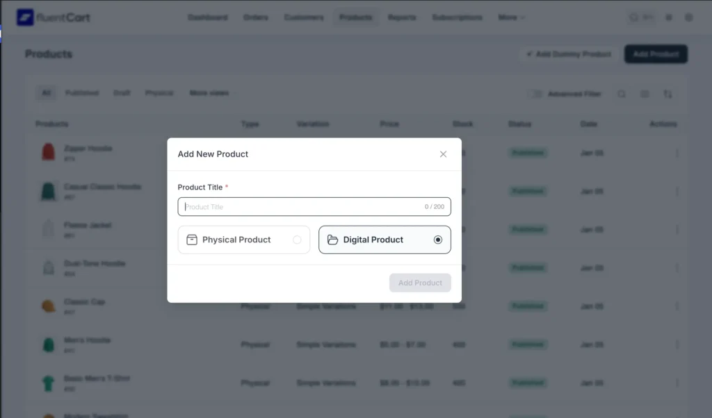 Head to FluentCart > Products, click Add New Product, and choose Digital.