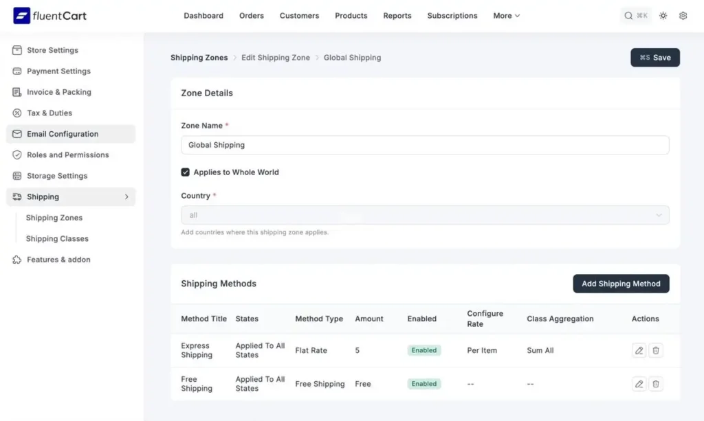 Go to FluentCart > Settings > Shipping and create your shipping zones and methods. Decide where you ship, how much it costs, and whether you offer free or flat-rate shipping.